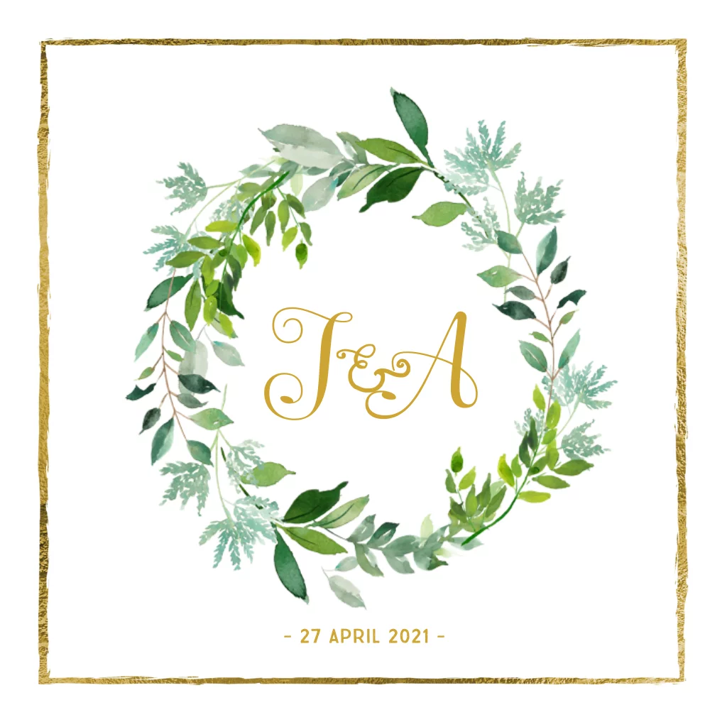 Stijlvolle trouwkaart goudfolie kader en eucalyptus plant krans