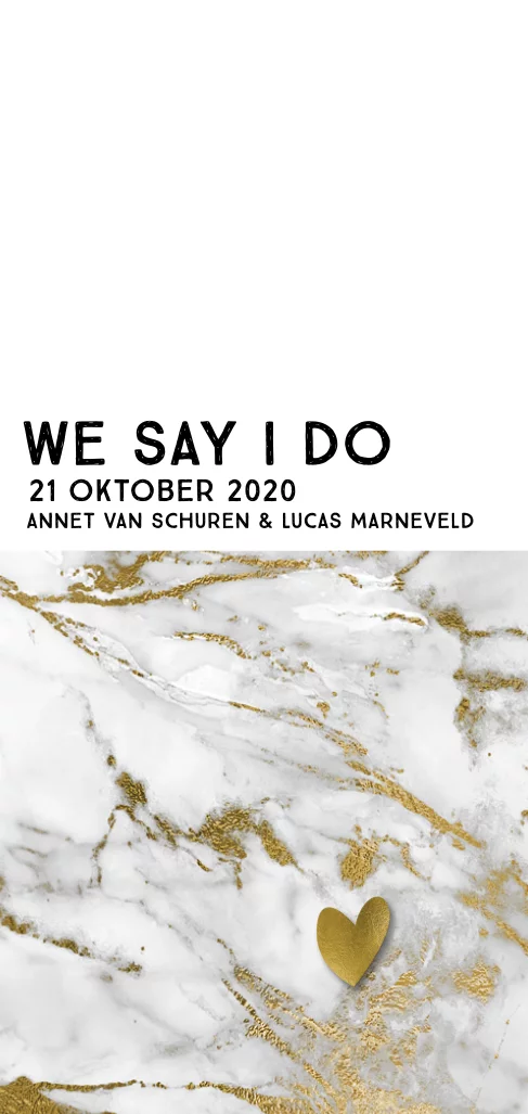 Opzoek naar een modieus chique trouwkaart? Witte basis met goud folie look marmer effect en wedding icoontjes. Zelf maken!