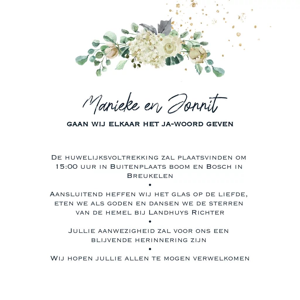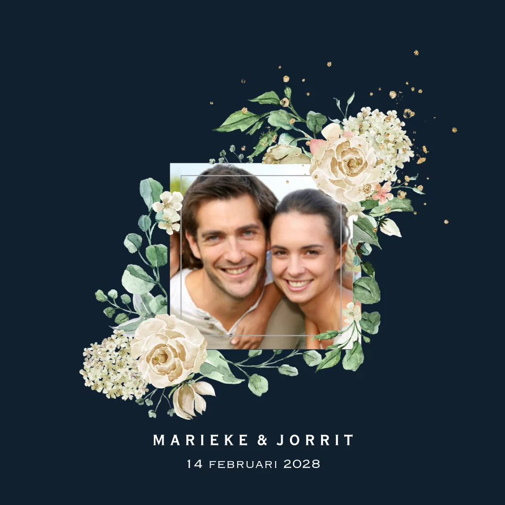 Klassieke huwelijksuitnodiging met grote witte bloemen op een blauwe ondergrond. Fotokader voor het plaatsen van een eigen foto. Kijk in onze editor bij 'Aquarel - Rozen Set' voor meer bloemen en ontwerp je eigen kaart. Alles staat los en is te bewerken.