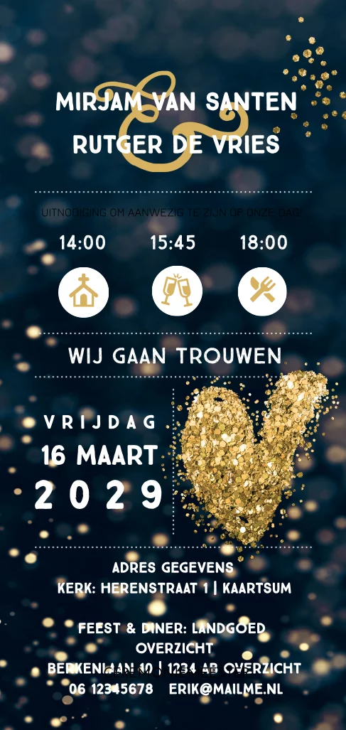 Chic en donkerblauwe sterrenhemel look trouwkaart met goud glitter look hart, wedding icons, stippellijnen vlakverdeling op de ondergrond. Zelf tekst aanpassen! Extra lang formaat 10x21cm!