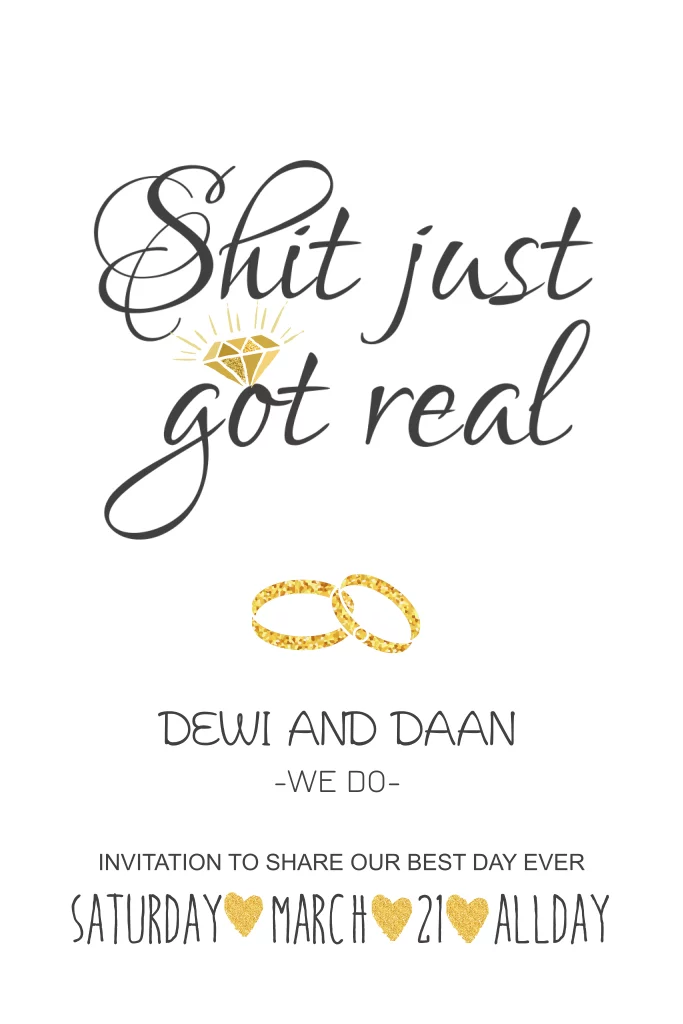 Hippe stoere uitnodiging voor jou bruiloft? Trendy trouwkaart in grijs wit met goudkleurige trouw elementen. Sierletters en voorbeeldtekst. Zelf maken