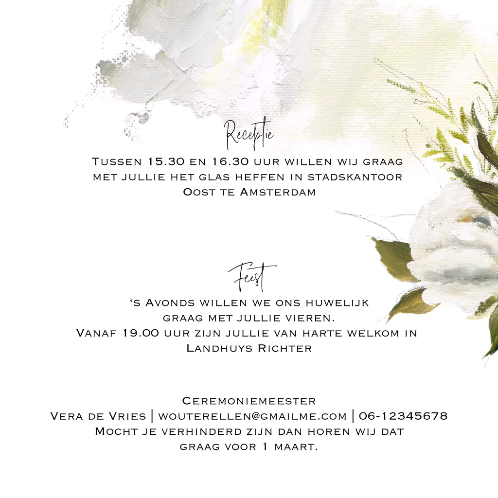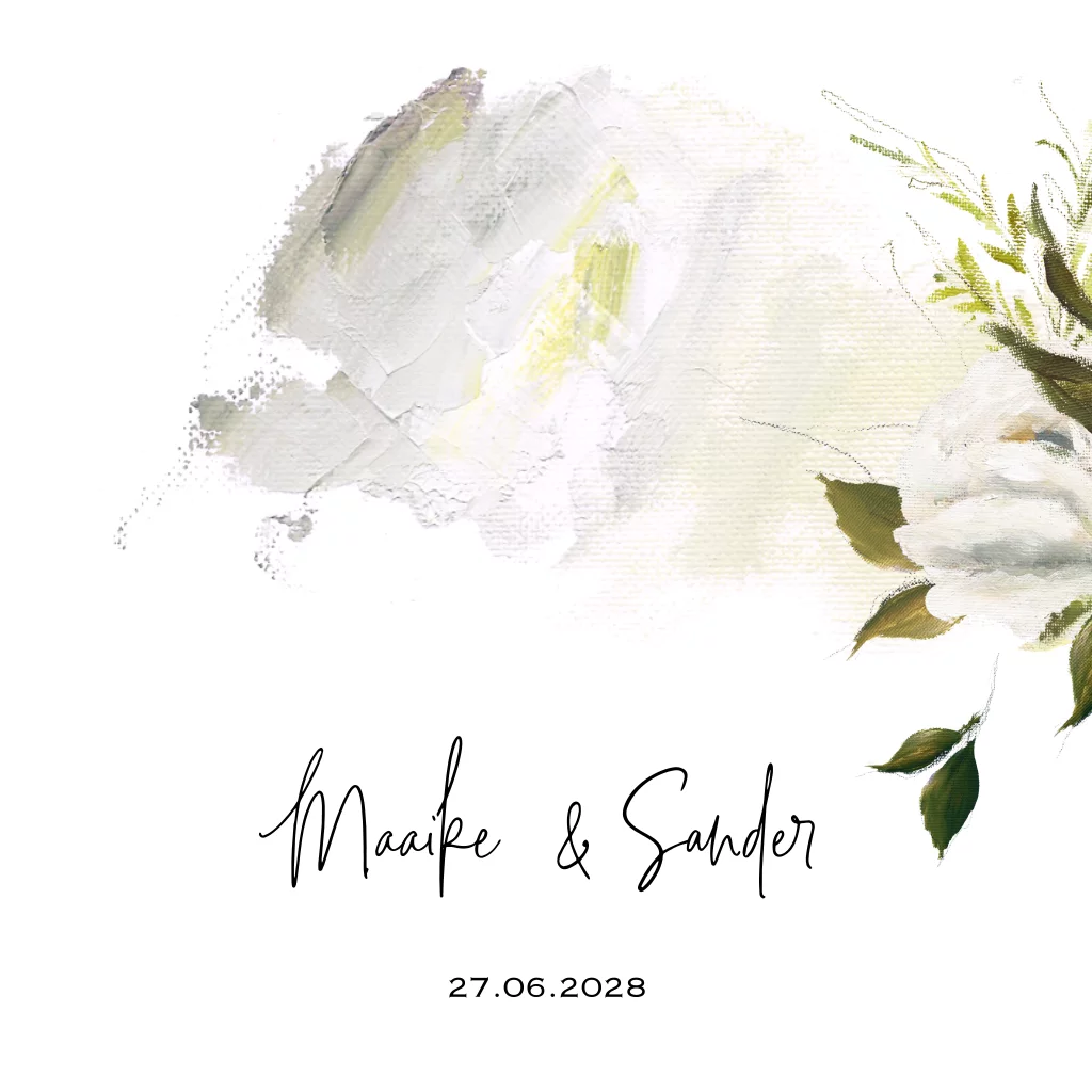 Prachtige floral chic trouwkaart met olieverf gekleurde penseel brush ondergrond en oil painting bloemen. Alles staat los en is te bewerken!