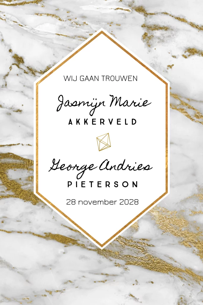 Elegante enkele staande trouwkaart met marmerprint. Met sierlijke letters en getekende diamantjes. Goud gekleurd omlijnd tekstkader. Marmerkleurige ondergrond. Zelf maken!