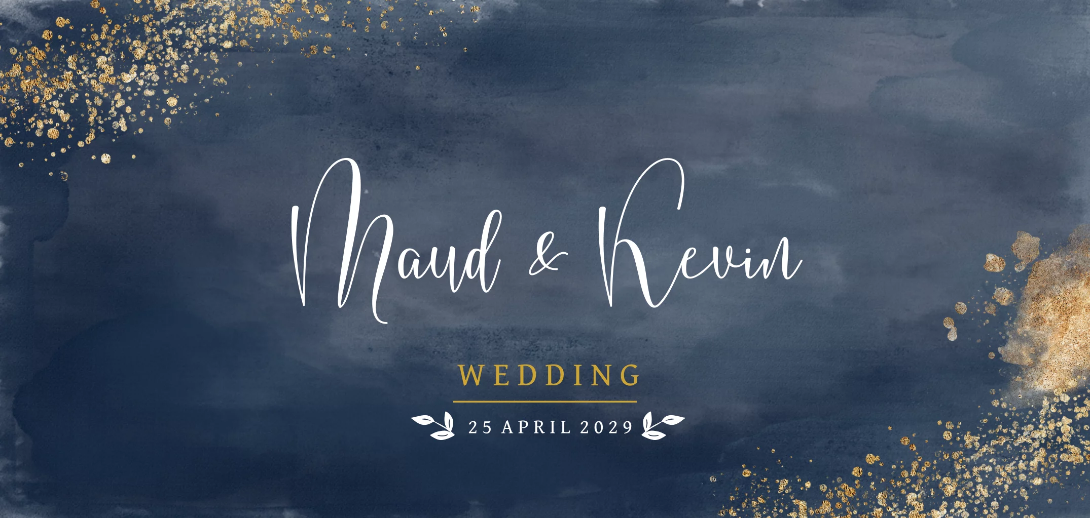 Chique dubbele panorama trouwkaart met donkerblauwe watercolor op de ondergrond en goudlook spetters en brush. Alles staat los en is zelf te bewerken.