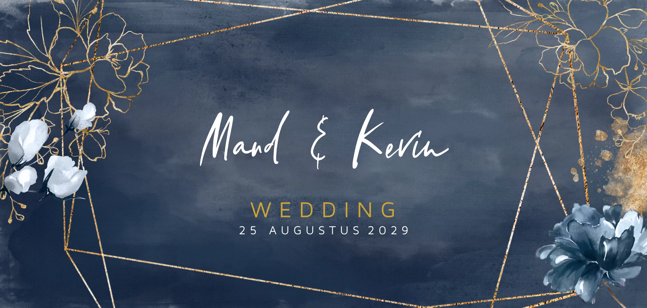 Chique panorama trouwkaart met goudlook outline bloemen en geo vormen op donkerblauwe watercolor. Alles staat los en is zelf te bewerken.