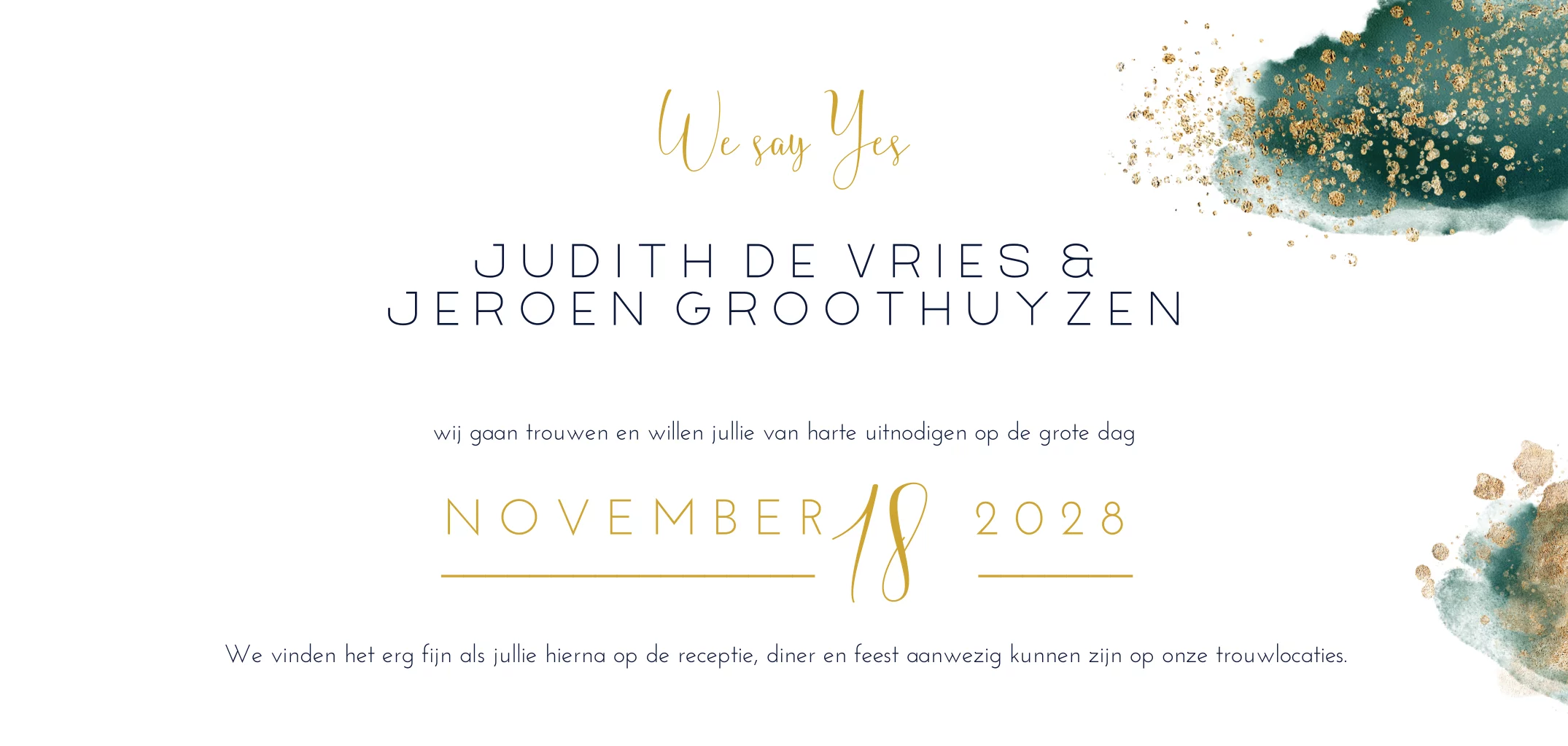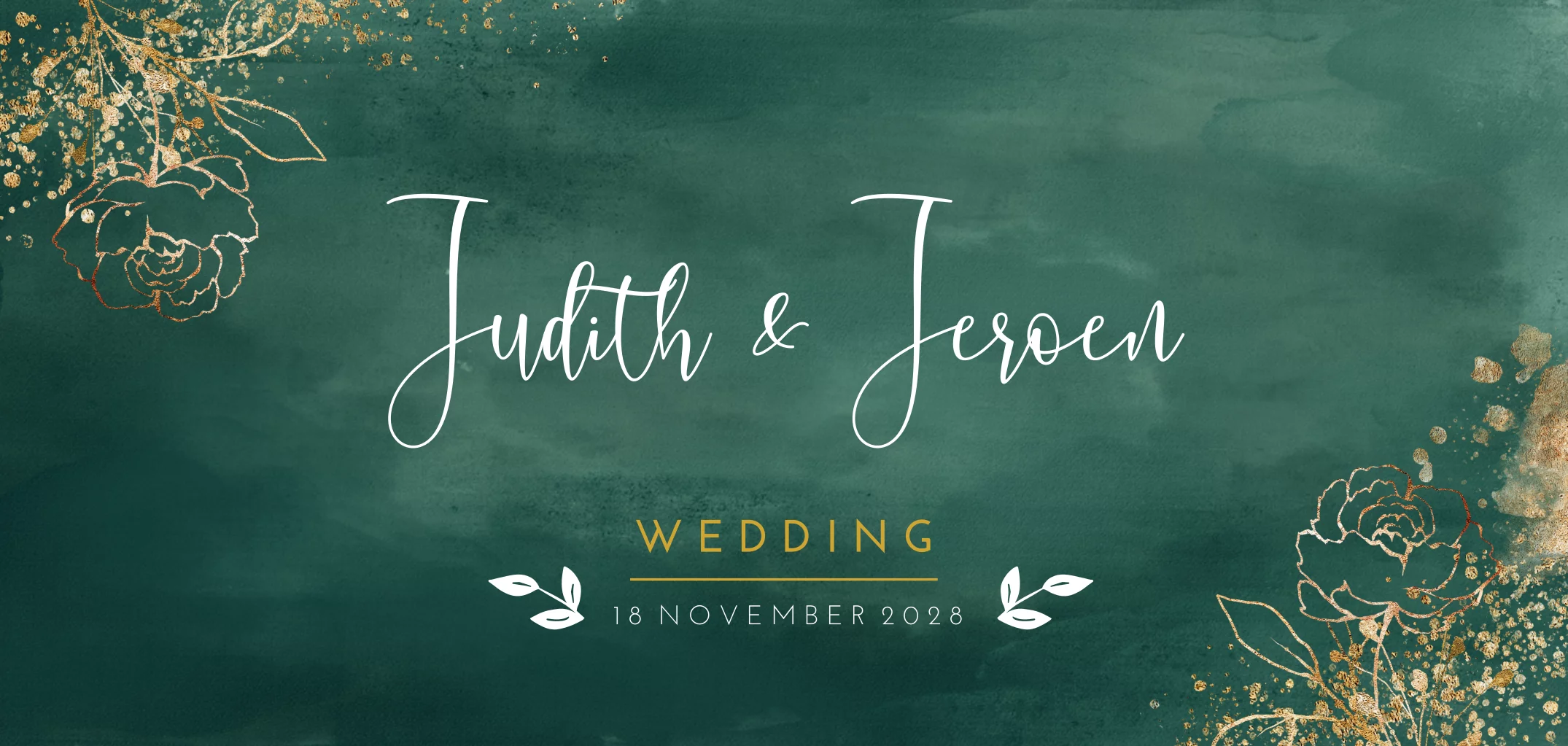 Chique dubbele panorama trouwkaart met donkergroene watercolor op de ondergrond en goudlook spetters en brush. Alles staat los en is zelf te bewerken.
