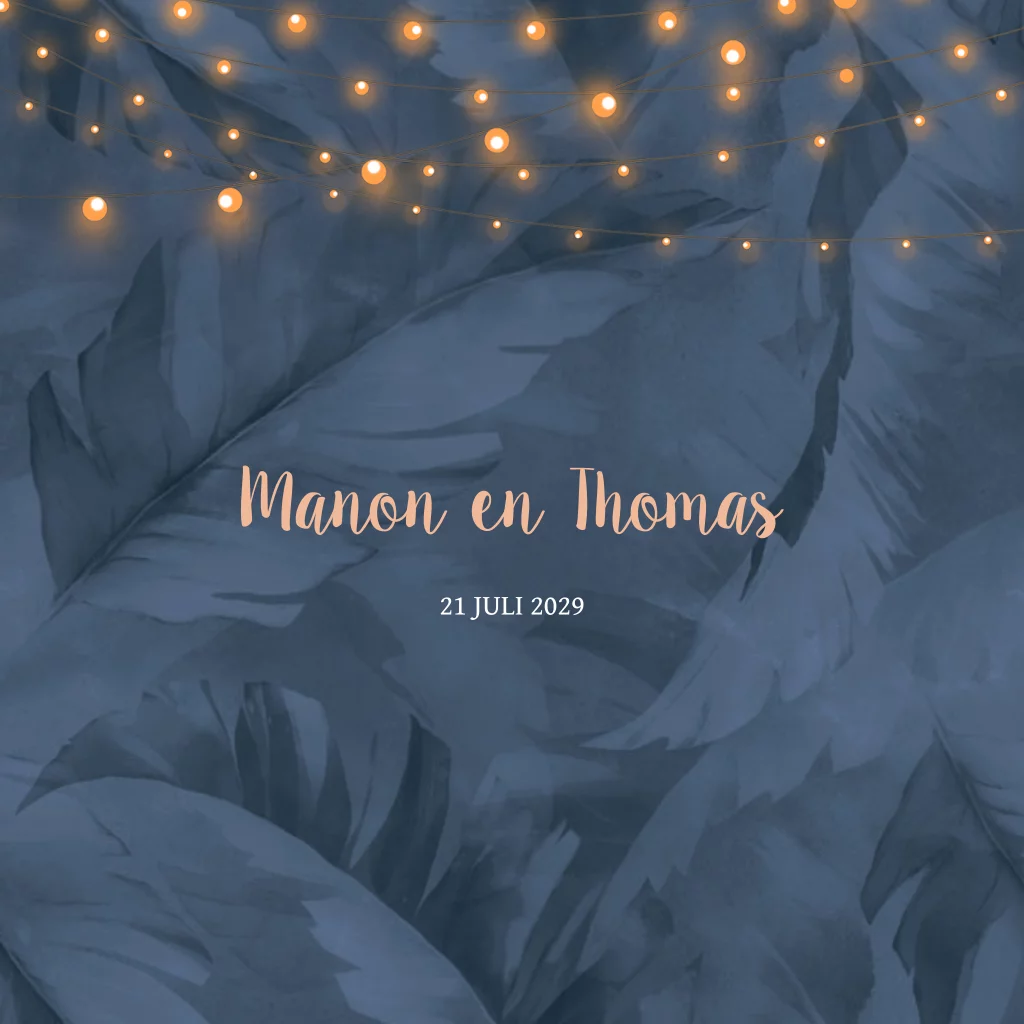 Hippe uitnodiging voor jullie huwelijk? Met blauwe blad achtergrond en oranje buiten lampjes.