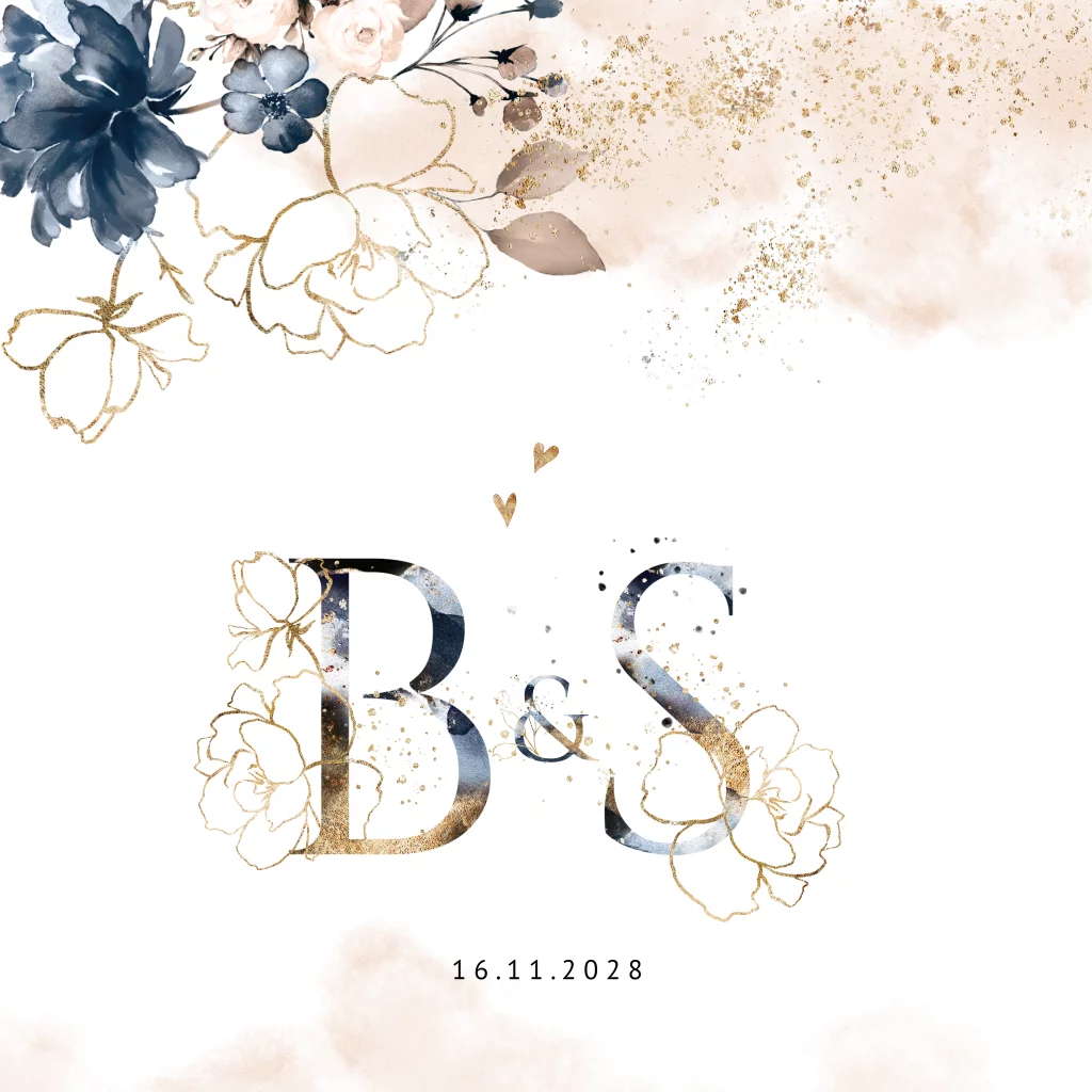 Botanische trouwkaart met bloemen initialen in blauw en goud