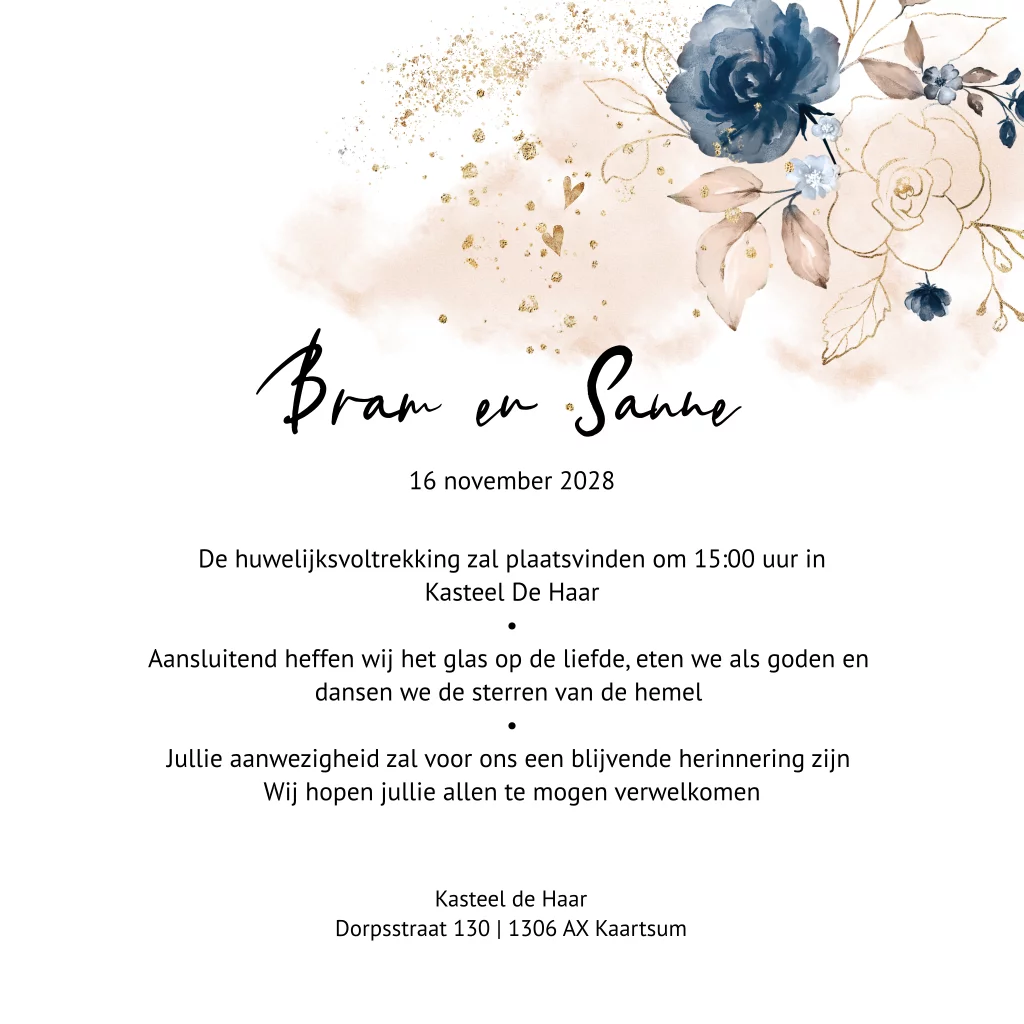 Romantische trouwkaart? Uniek en stijlvolle trouwkaart met blauw roze bloemen in watercolor stijl met getekende bloemen in goud (look). Achtergrond met roze aquarel en goud (look) poeder. Alles staat los en is zelf te maken. Kijk in onze editor bij 'Afbeelding en versiering - Alfabet donkerblauw chic' voor jullie eigen initialen.
