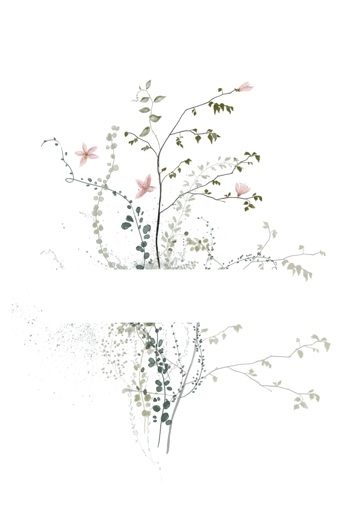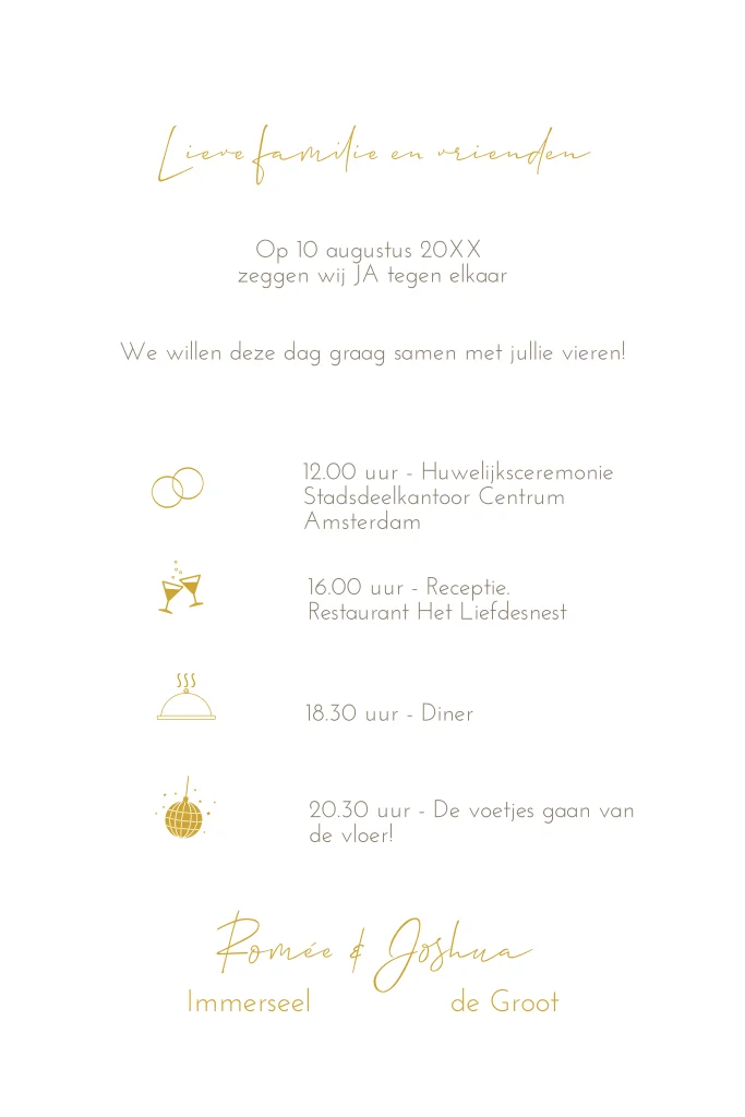 Een prachtige botanische trouwkaart met de namen in echt goudfolie en een bouquet met geschilderde watercolor takjes en eucalyptus blaadjes en kleine roze bloemetjes.
