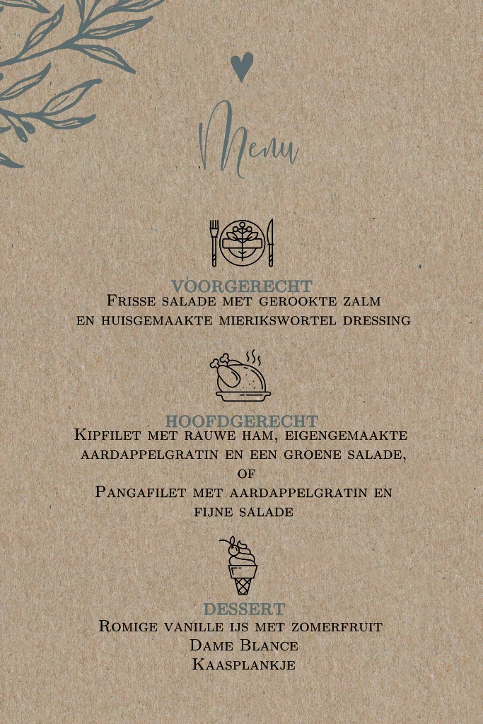 Kraft menu en drank kaart voor de gasten met prachtige eet iconen, takje en donkergroene touch. Veel mogelijkheden qua iconen uit de beeldbank.