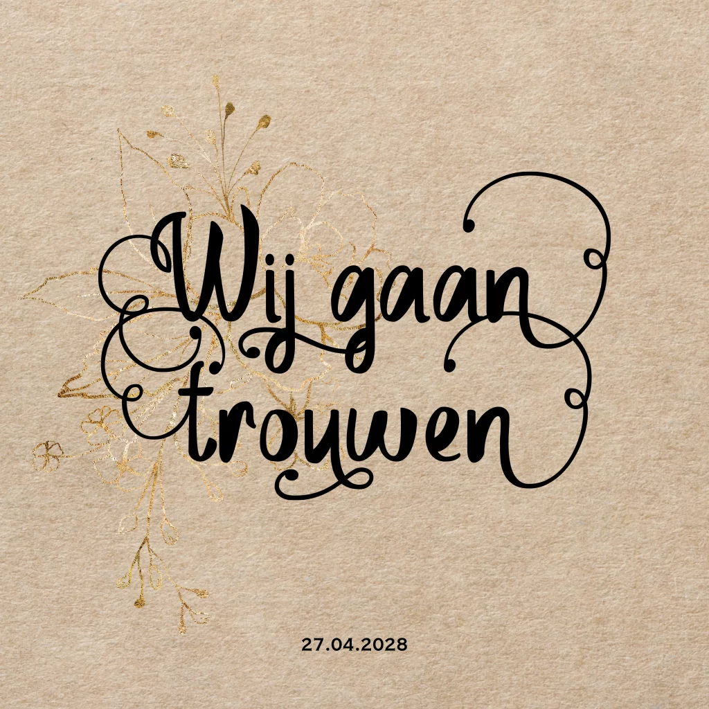 Hippe enkele vierkantee trouwkaart met kraft look, handlettering en goud look outline bloemen.