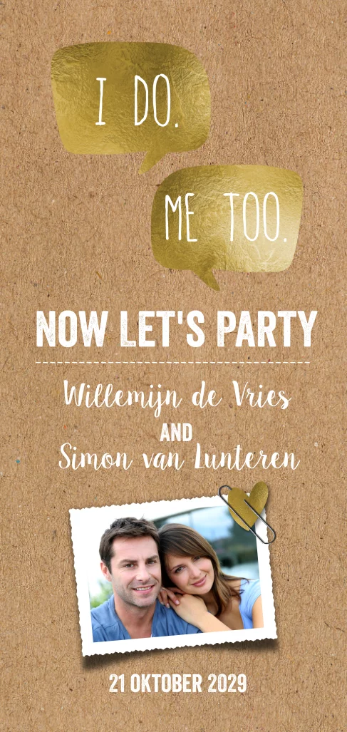 Opzoek naar een hippe en strakke trouwkaart op kraft / karton design die jezelf kan maken? Met stoere letters, foto kader, lijntjes, goud look hartjes, tekstballonnen en wedding icoontjes. Zelf maken!