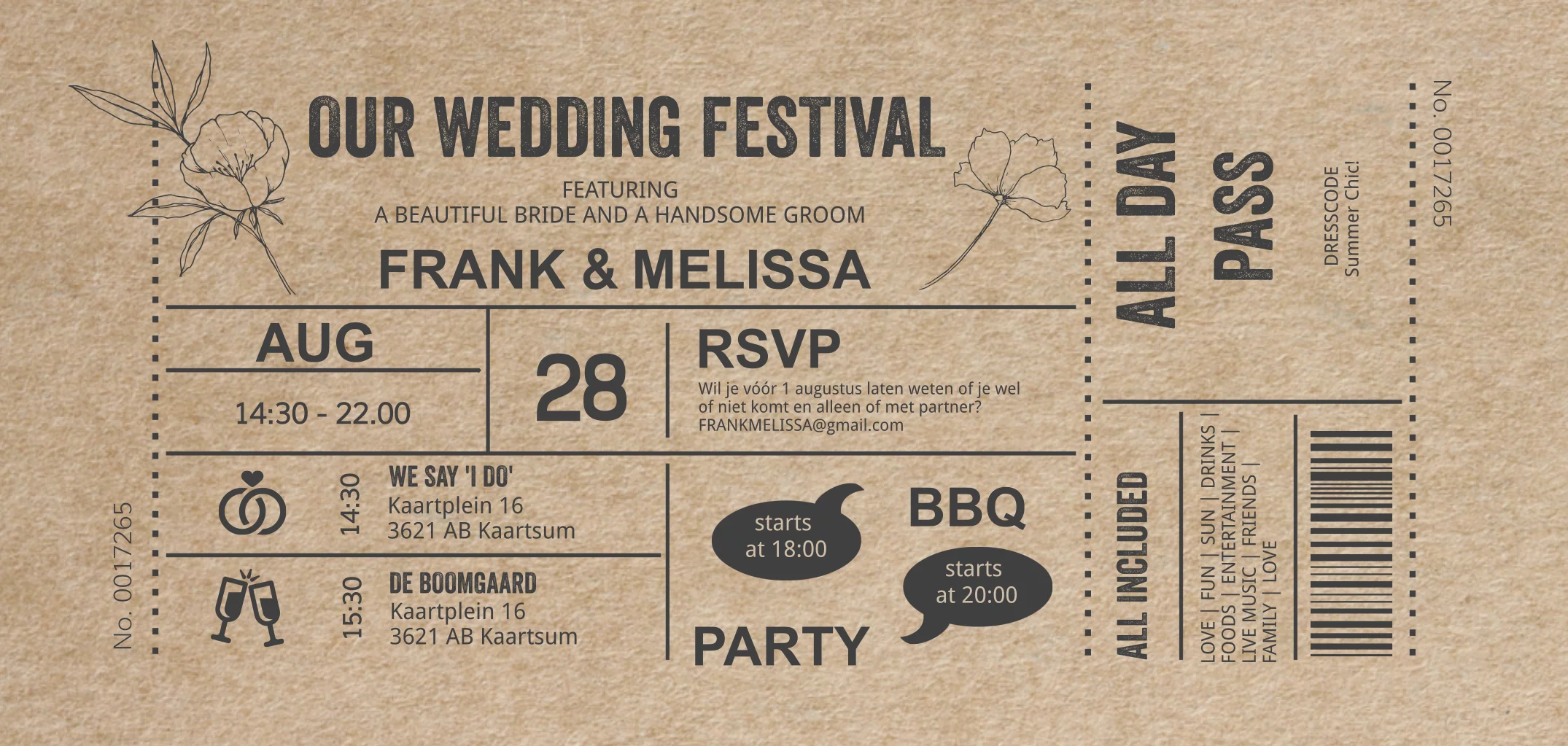 Opzoek naar een hippe kraft look panorama trouwkaart die lijkt op een toegangskaart voor een festival of concert? De lijnen staan vast je hoeft alleen maar zelf te vullen met jullie eigen tekst en icoontjes. Teksten kleur zijn allemaal aan te passen. Zelf maken. Voor meer icoontjes kijk in onze editor onder 'Symbolen -Trouwen' 'Tekst ballon' enz.