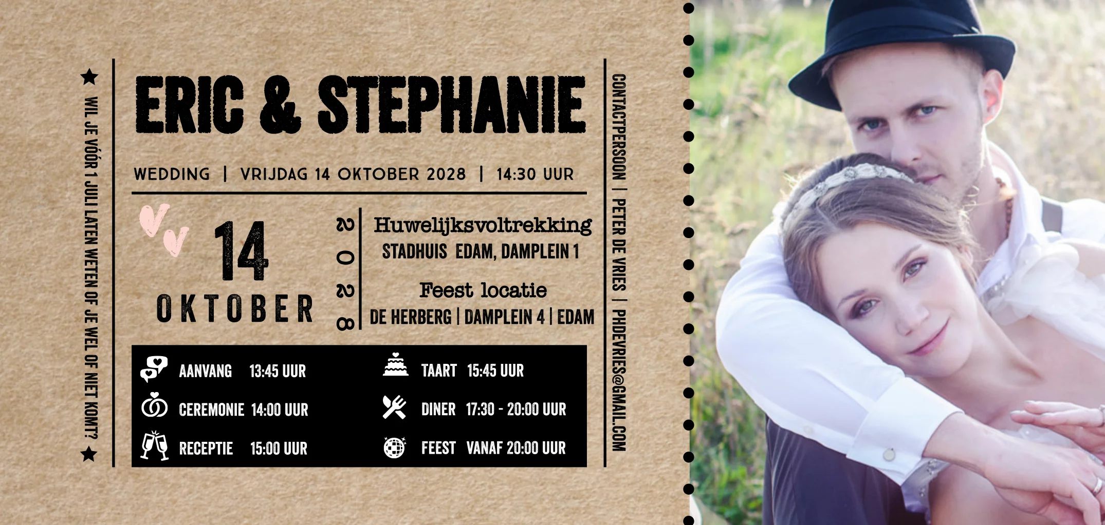 Opzoek naar een hippe panorama trouwkaart die lijkt op een toegangskaart van festival of concert? Trouwkaart met kraft look op de ondergrond, eigen foto en lijn grid. Teksten zijn allemaal aan te passen. Zelf maken.