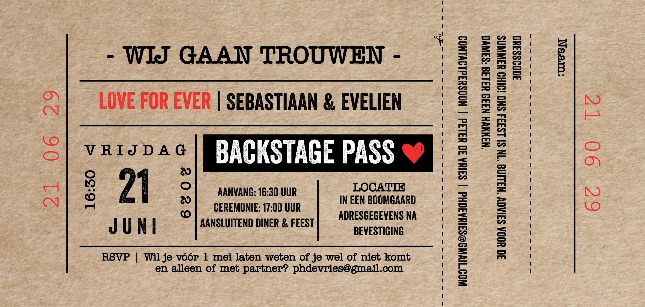 Opzoek naar een hippe panorama trouwkaart die lijkt op een toegangskaart van festival of concert? Trouwkaart met kraft look op de ondergrond en lijn grid. Teksten zijn allemaal aan te passen. Zelf maken.