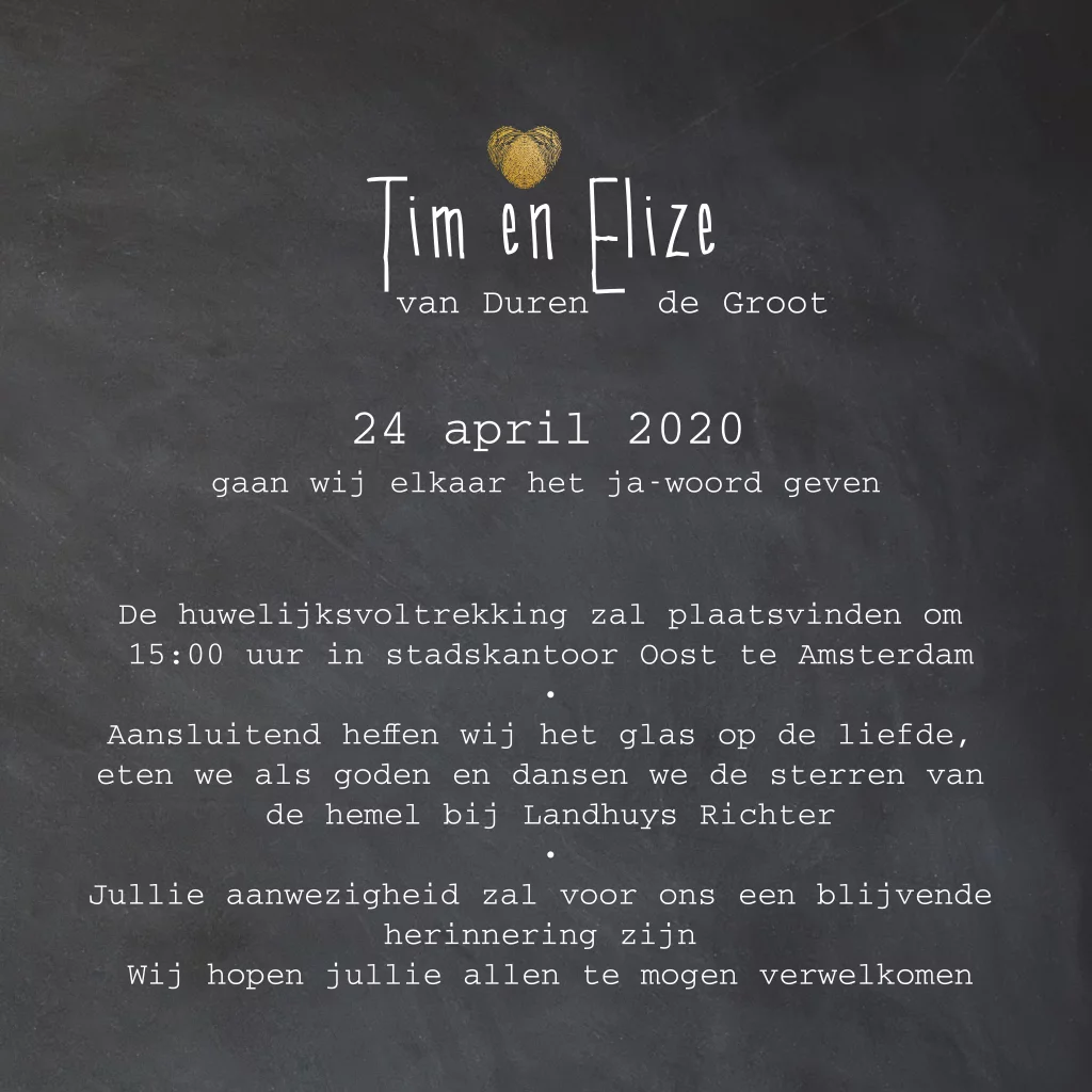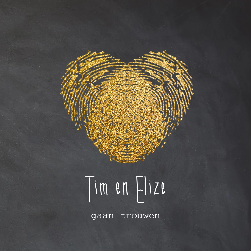 Dubbele hippe krijtbord trouwkaart met goud gekleurde vingerafdrukken in de vorm van een hart. Goud is een look. Alles aan deze kaart is te bewerken!