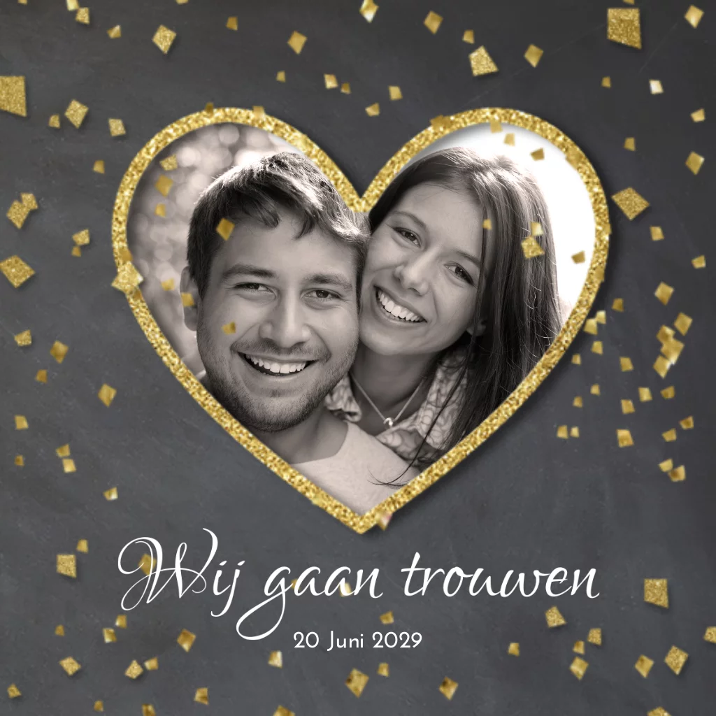 Krijtbord uitnodiging bruiloft met eigen foto in gouden hart