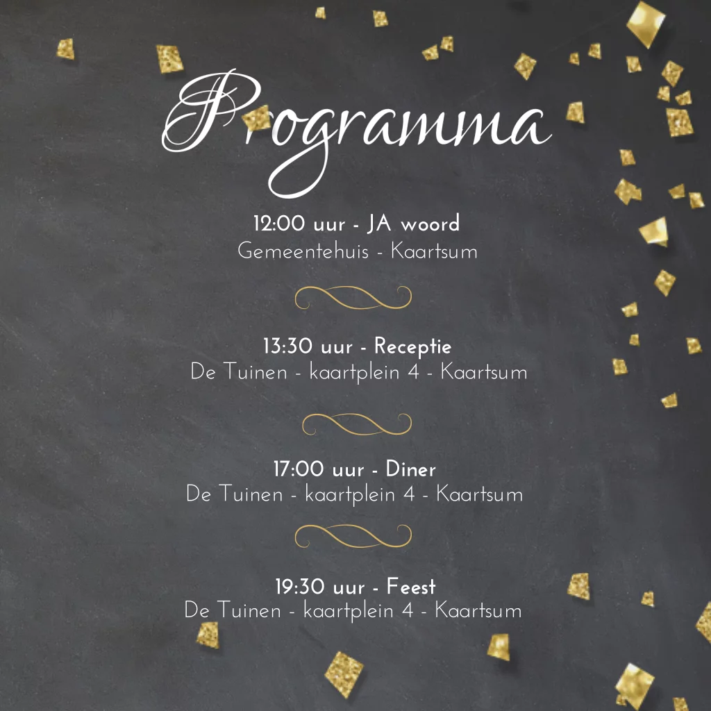 Romantische stoere uitnodiging voor jullie bruiloft? Met krijtbord design op de ondergrond en goud look glitter confetti blokjes. Zelf maken!