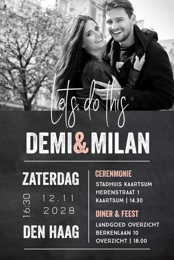 Uitnodiging bruiloft met schoolbord achtergrond en ruimte voor een eigen foto. Stoer lettertype met een vleugje rose. De letters kun je elke kleur geven die je wilt. Achterkant versierd met leuke icoontjes. In onze beeldbank vind je meerdere icoontjes die je gratis kunt gebruiken. Ga lekker aan de slag met deze stoere kaart en maak hem zelf helemaal naar jouw wensen.