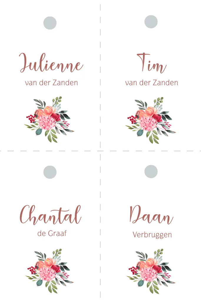 4 DIY naamkaartjes voor jullie tafelschikking wit met prachtig aquarel bloemen boeket. Gebruik de stippellijn voor het zelf opmaken van de kaartjes. Je kunt de stippellijn precies in het midden plaatsen via de optie 'uitvullen'! Ben je klaar met bewerken? Verwijder dan de stippellijn en de zwarte 'perforeer' rondjes voordat je het kaartje besteld. Snij het kaartje in 4 gelijke delen en perforeer ze. Bevestig het kaartje aan je menukaart of plaats ze in een kaarthouder.