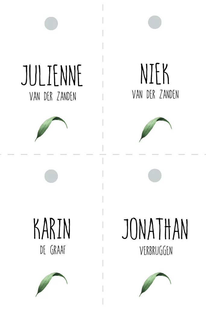 4 DIY naamkaartjes voor jullie tafelschikking wit met botanische aquarel bladgroen. Gebruik de stippellijn voor het zelf opmaken van de kaartjes. Je kunt de stippellijn precies in het midden plaatsen via de optie 'uitvullen'! Ben je klaar met bewerken? Verwijder dan de stippellijn en de zwarte 'perforeer' rondjes voordat je het kaartje besteld. Snij het kaartje in 4 gelijke delen en perforeer ze. Bevestig het kaartje aan je menukaart of plaats ze in een kaarthouder.