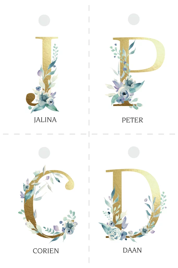 4 DIY naamkaartjes. Versierd met goud look (geen echt goud) initialen van jullie gasten. Gebruik de stippellijn voor het zelf opmaken van de kaartjes. Je kunt de stippellijn precies in het midden plaatsen via de optie 'uitvullen'! Ben je klaar met bewerken? Verwijder dan de stippellijn en de 'perforeer' rondjes voordat je het kaartje besteld. Snij het kaartje in 4 gelijke delen en perforeer ze. Bevestig het kaartje aan je menukaart met een touwtje of plaats ze in een kaarthouder.