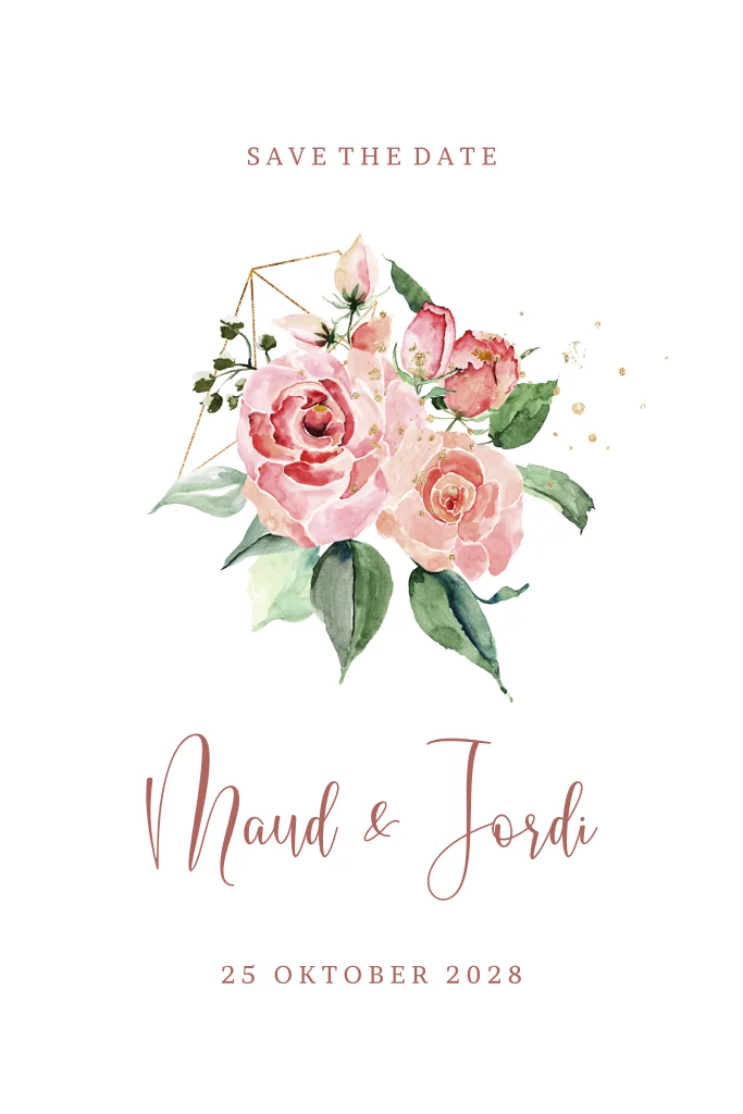 Boho uitnodiging save the date voor huwelijk. Met rose rozen boeket in watercolor en goudlook spetters geovormen. Alles staat los en is te bewerken. Ronde hoekjes aanpasbaar.