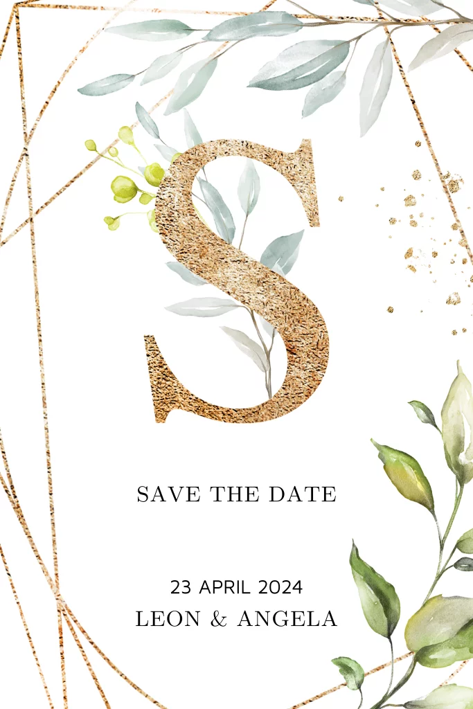 Moderne watercolor greenery save the date trouwkaart. Met bladeren van watercolor en grote S van save the date en framed in goudlook. Zelf maken!
