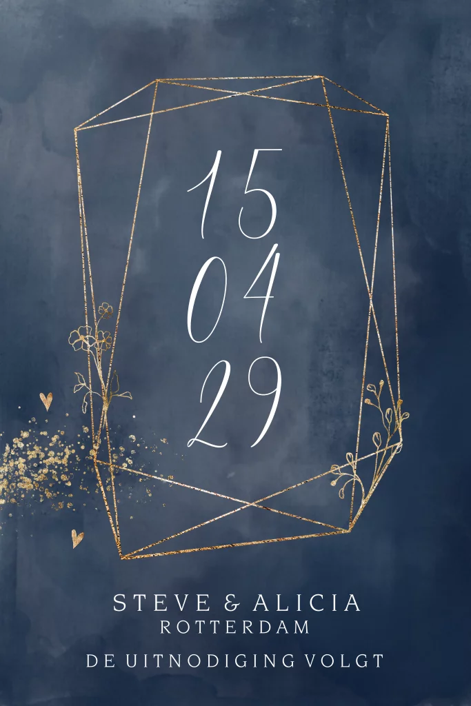 Opzoek naar een navy blue save the date kaart? Met blauwe watercolour afbeelding op de ondergrond en goudlook geo- en botanische vormen. Zelf maken!
