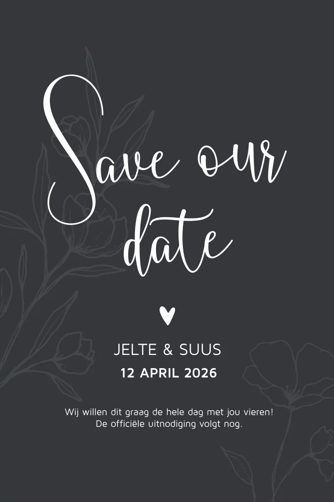 Unieke enkele save our date trouwkaart met écht foliedruk. In een warme blauwe tint met speels geplaatste losse outline takjes. Ook mogelijk in andere foliedruk kleuren. Zelf maken!