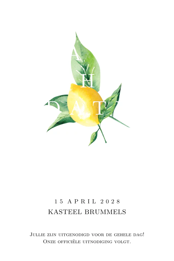 Botanische enkele save the date kaart met citroen, blad en écht foliedruk. Alles staat los en is zelf te maken! Andere citroen afbeeldingen zijn te vinden in de beeldbank.