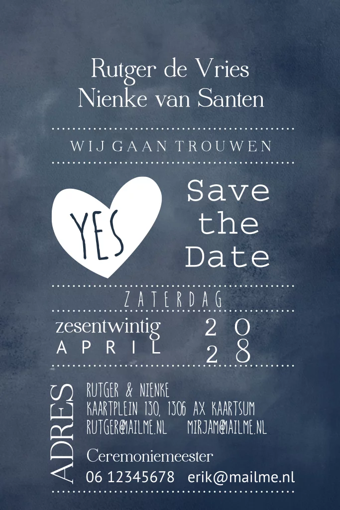 Hippe enkele donkerblauwe watercolor grafische save the date kaart met stippellijn. Elke andere kleur is mogelijk! Kies de kleur die past bij jullie stijl en thema.