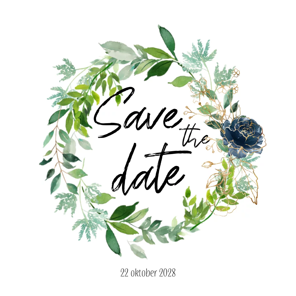 Romantische enkele save the date kaart met Eucalyptus bladgroen in een krans vorm met goudlook bloem en blauwe bloem. Zelf maken!