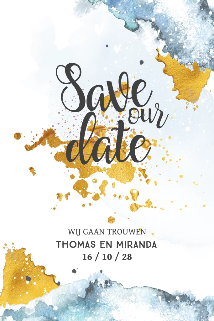 Unieke staande trouwkaart met blauwe aquarel vlek en goud look (geen echt goud) vlek. Versierd met witte dots en hartjes. Alles staat los en is te bewerken!