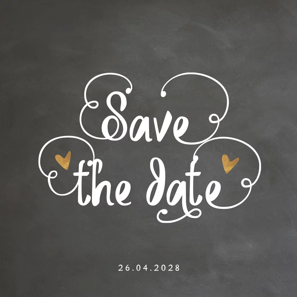 Unieke save the date kaart met krijtbord print, handlettering en koper kleurige hartjes. Optie ronde hoekjes.