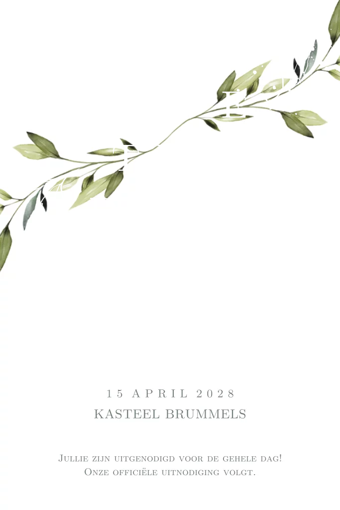 Botanische enkele save the date kaart met eucalyptus blad takje en écht foliedruk. Alles staat los en is zelf te maken! Andere bladeren zijn te vinden in de beeldbank.