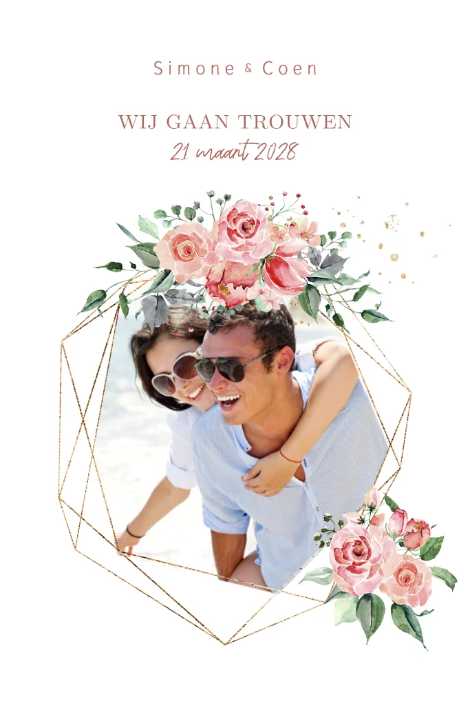 Industrial romance save the date kaart met geometrische vormen in goudlook (geen echt goud) en rose rozen bloemen met ruimte voor een eigen foto. De bloemen vind je in onze editor onder 'Watercolor Rozen set'. ronde hoekjes zelf aanpassen.