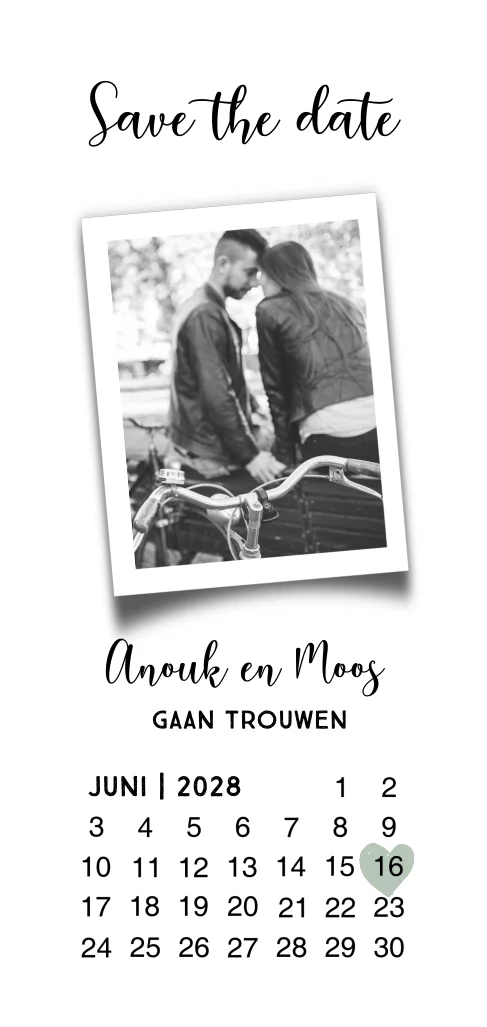 Opzoek naar een save the date kaart met kalender in zwart wit? Met fotokader voor het plaatsen van een eigen foto! Zelf maken!