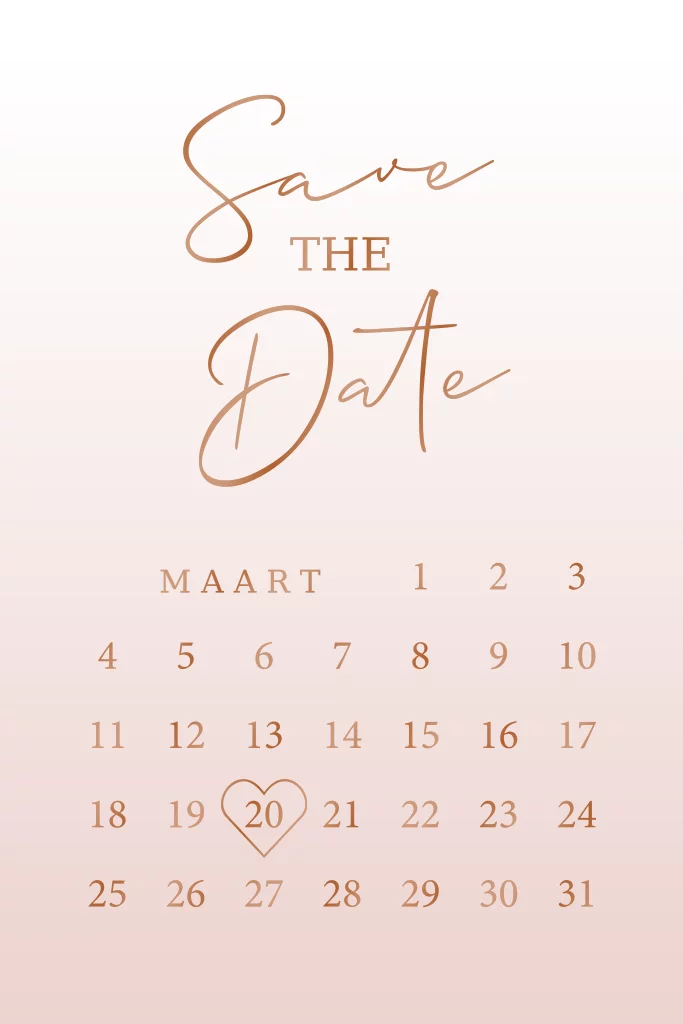 Moderne stijlvolle save the date uitnodiging agenda met verloop. Met hoogglans koper lak. Alles is om te kleuren. Met optie ronde hoekjes.