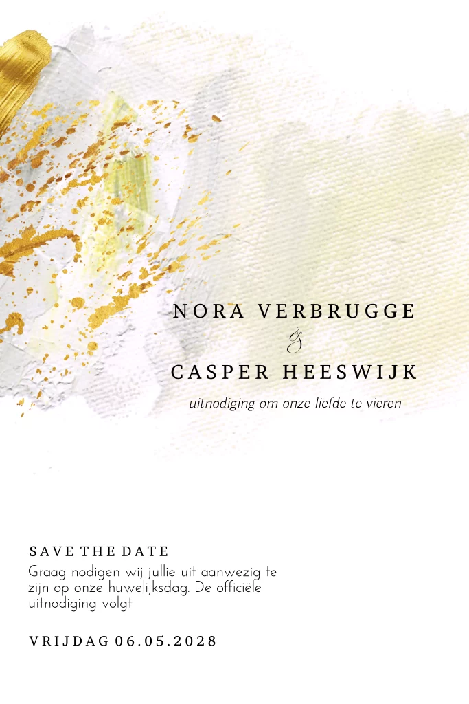 Strakke enkele save the date kaart met olieverf effect! Met prachtige warm gele penseel streep en goud glitter look spetters. Alles staat los en is zelf te maken! Andere penseel strepen zijn te vinden in de beeldbank.