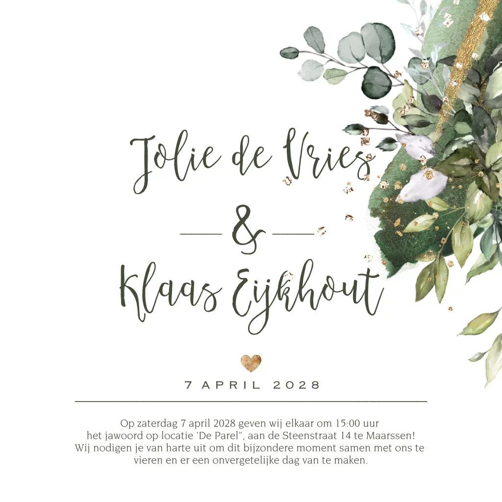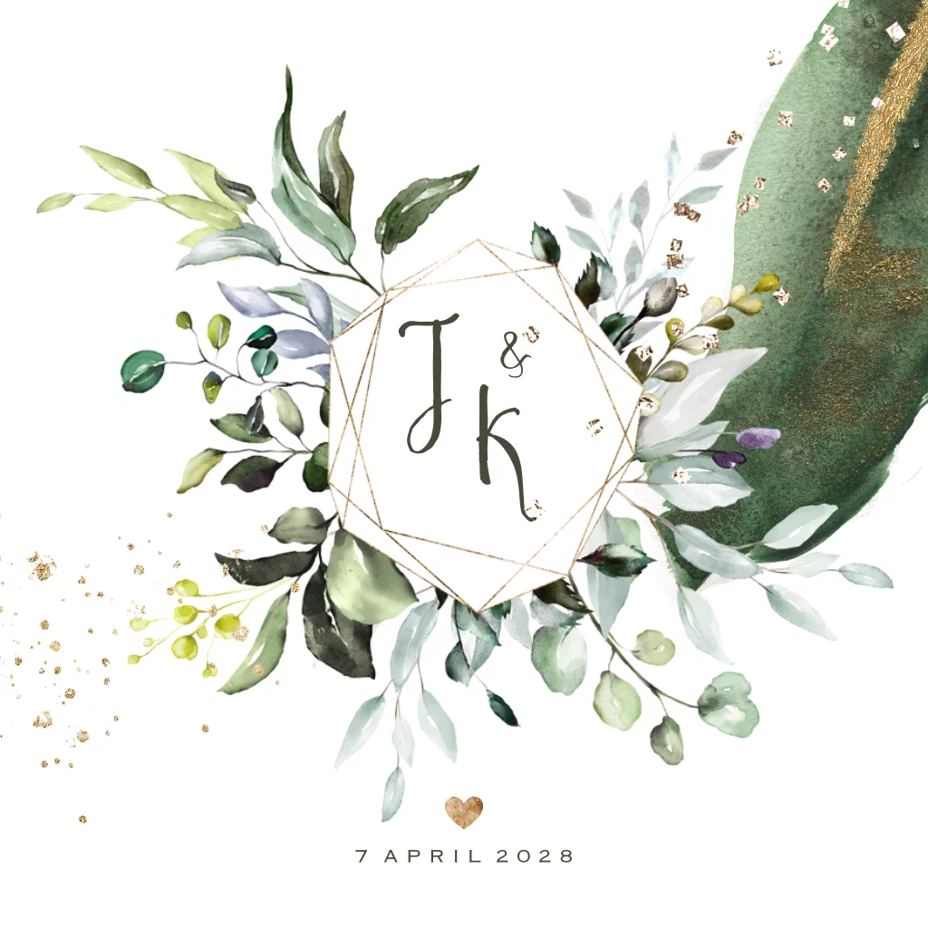 Eucalyptus krans trouwkaart met prachtige watercolor bladeren in groene tinten. Alle wedding iconen zijn te vervangen naar keuze, zie de beeldbank.