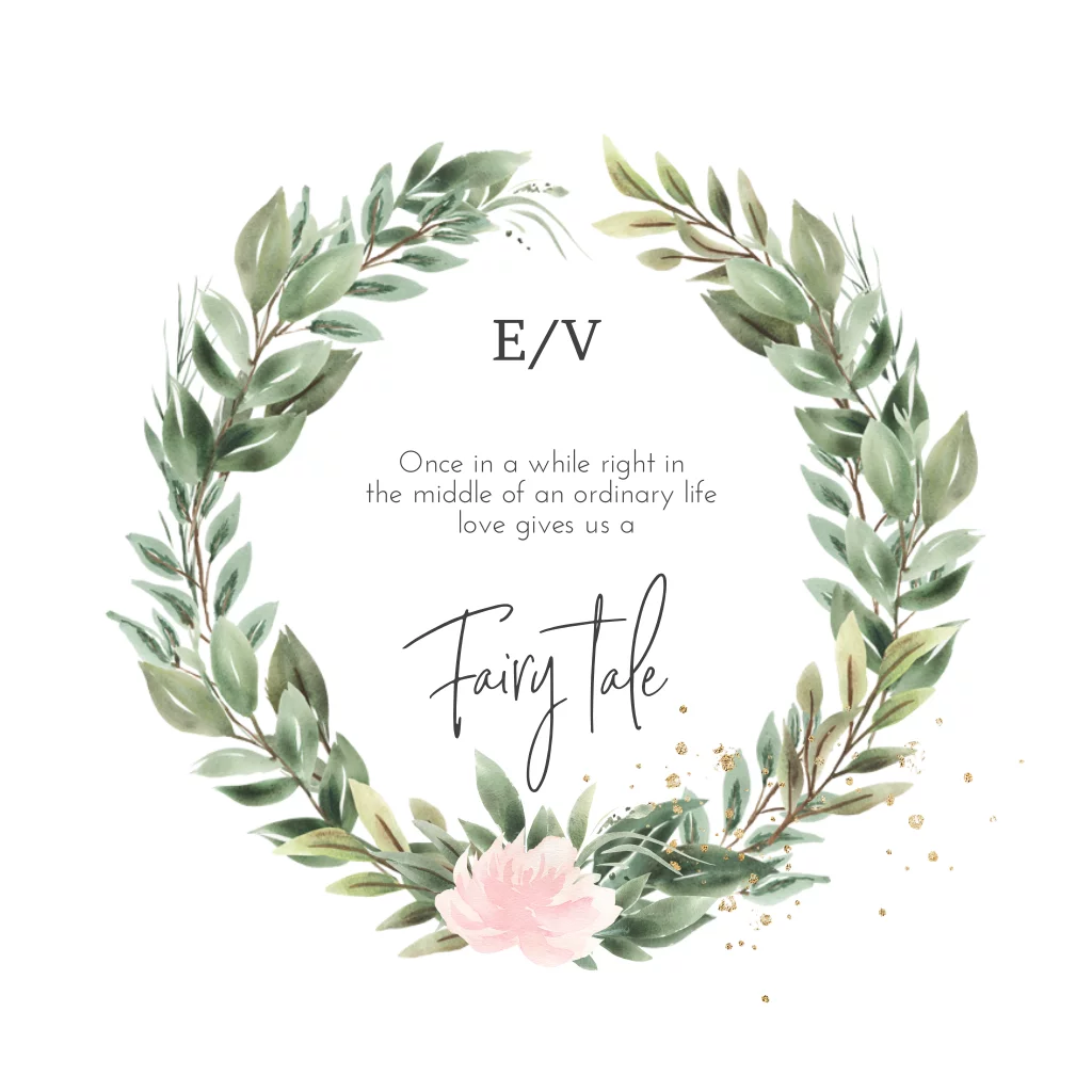 Enkele vierkante romantische Save the date kaart met donker bladgroen krans en roze bloem. Versierd met jullie initialen en een liefdes gedicht. Alles staat los en is te bewerken.