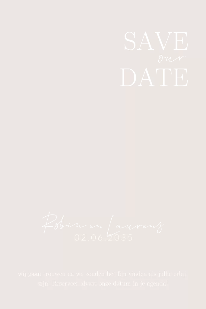 Deze save the date kaart past eigenlijk in elke stijl wel thuis! Verander de kleuren naar jullie wensen en/of thema en maak de kaart persoonlijk! Op de achterkant is er ruimte om jullie love shoot foto te plaatsen! (999999)