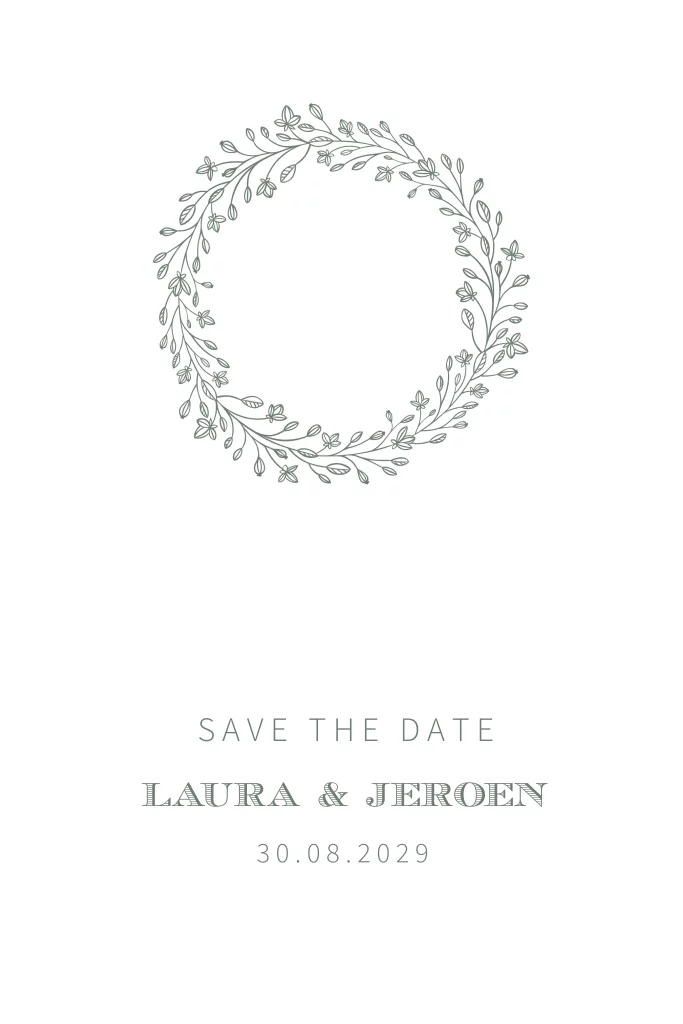 Een klassieke & stijlvolle save the date kaart met een getekende krans. Pas de kleuren en teksten aan in de editor en maak de kaart persoonlijk en uniek. (999999)