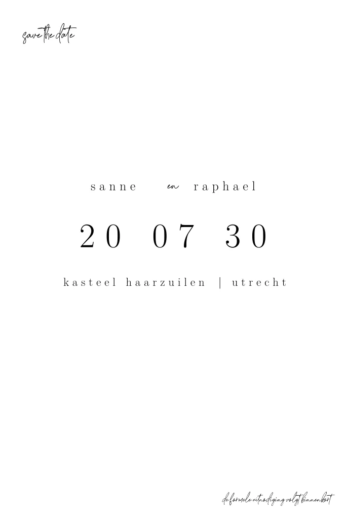 Zoeken jullie een save the date kaart met minimalistisch design? Dan zit je met deze zwart/wit save the date helemaal goed. (999999)