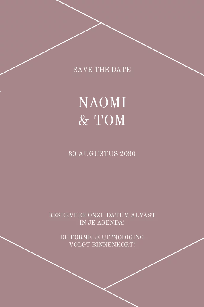 Mooi he? Een save the date met grafische vlakken, een chic rosegoudfolie randje en de tekst in rosegoudfolie. In de editor is deze uitnodiging helemaal naar je eigen wensen op te maken. (999999)