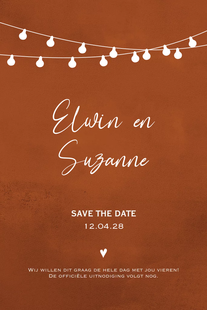 Mooie staande save the date trouwkaart in meerdere formaten en kleuren beschikbaar. Met festival lampjes en teksten in écht folie gedrukt. Met cognac kleur velvet look op de onderzijde. Zelf maken.