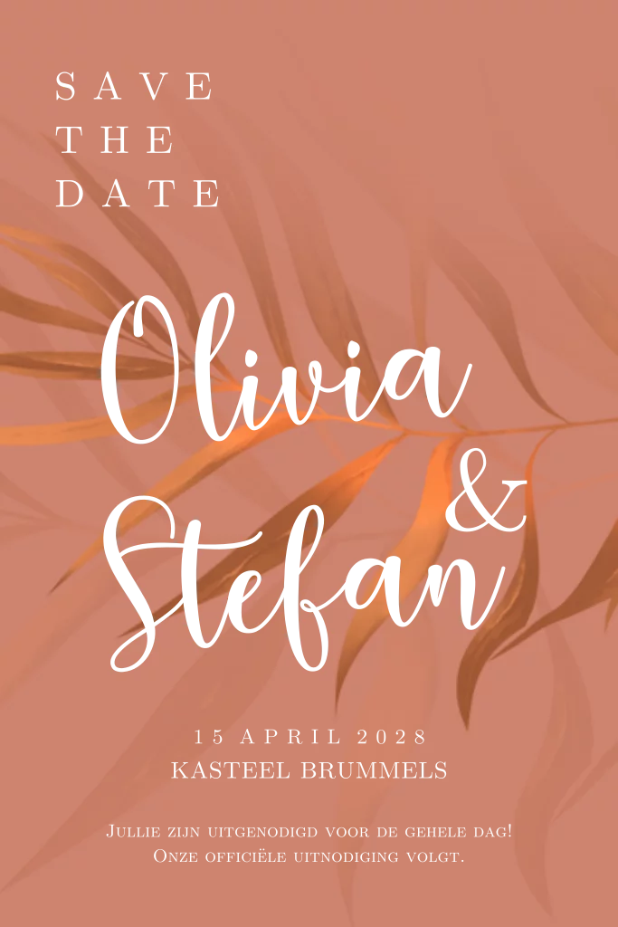 Prachtige exotica terracotta blad watercolor save the date kaart met foliedruk tekst.