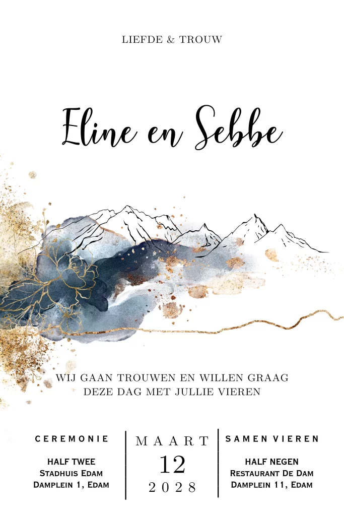 Winterse trouwkaart met donkerblauwe aquarel, bergen, bloem en spetters in goud poeder look (geen echt goud). Zelf maken.